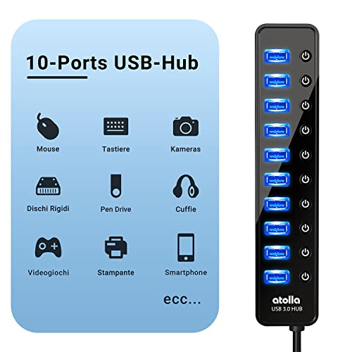 Atolla Hub USB 3.0 con Alimentazione, 10 Porte USB Hub per il Trasferimento dei Dati con Nterruttore On/Off e Alimentatore 30W (12V/2.5A)