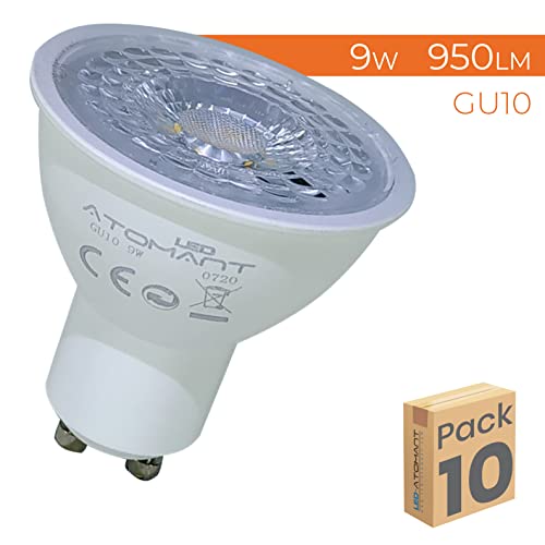 LED ATOMANT Confezione 10x lampadina LED GU10 9W. Colore Bianco Caldo (3000K). 950 Lumen. LED alogeno equivalente a 95W.
