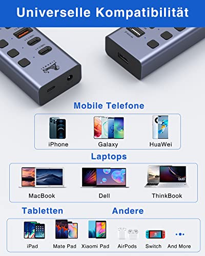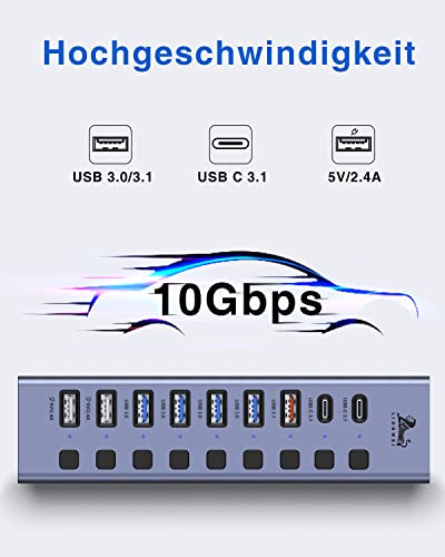 Hub USB attivo 3.0 con alimentatore di rete da 60 W (12 V/5 A), connettore multiplo USB Hub, hub 10 in 1 USB-C con 2 USB-C 3.1 10 Gbps, 4 USB-A 3.0, 3 porte di ricarica e interruttore on/off