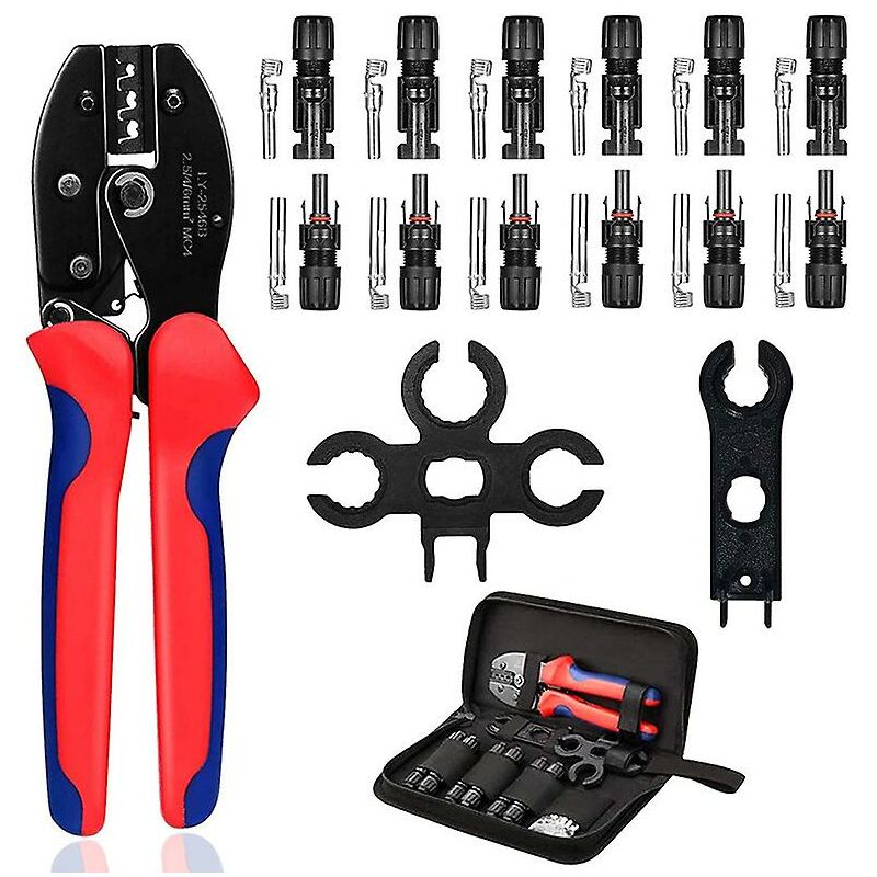 Pinza a crimpare versatile: per un'installazione facile e precisa dei connettori solari MC4. Il design preciso dello stampo a crimpare e il blocco completo garantiscono un'elevata qualità di crimpatura durante ripetute crimpature (2,5-6 mm). I morsetti terminali hanno un'impugnatura ergonomica, che consente di risparmiare manodopera e non fa fatica durante l'utilizzo. Adatto per strumenti di crimpatura per connettori solari MC4. La confezione verrà fornita con 1 crimpatrice fotovoltaica, 2 chiavi, 1 borsa in tela, 12 terminali, 12 connettori, comoda e affidabile da usare, comoda da trasportare.
