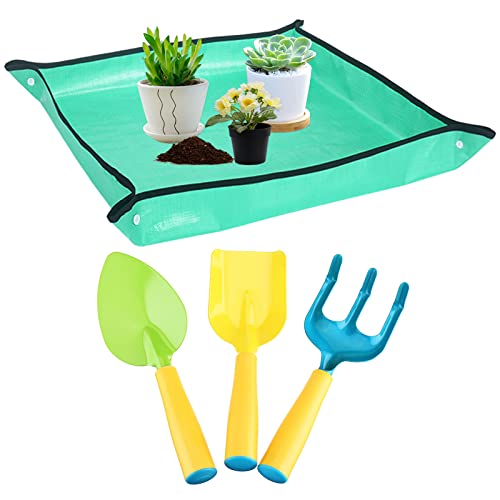 Set Attrezzi da Giardinaggio per Bambini, 4 Pezzi Strumenti da giardinaggio per Bambini con Tappetino per Piante, Rastrello, Pale, Giocattoli da Giardino per Bambini, Attrezzi da Spiaggia