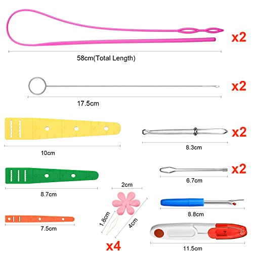 Contenuto della confezione: 2 infila coulisse in plastica, 2 ganci per tornitura ad anello da cucito, 2 infila coulisse in metallo, 2 pinzette in metallo, 1 forbici, 1 ripper per cuciture, 4 infila aghi, 3 infila piatte, 17 pezzi infila cordoncino, 17 pezzi infila cordoncino.