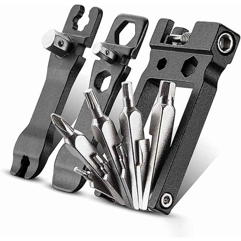 19 in 1: 19 funzioni in un kit di attrezzi per la riparazione della biciclettaDesign unico: può essere piegato di piccole dimensioniAlta qualità: realizzato in resistente acciaio al cromo vanadioPortatile: compatto e leggero per si adattano perfettamente alle borse da equitazioneMultifunzione: fissacatena robusto e robusto, leve per pneumatici, chiave inglese. per bici, chiave a raggi