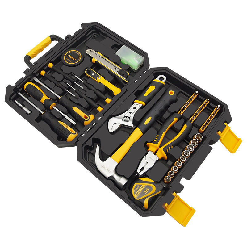 Il set di strumenti per la riparazione della casa davvero perfetto. Questo set di utensili manuali da 100 pezzi è una cassetta degli attrezzi completa che copre tutto, dal taglio al fissaggio, dalla misurazione alla maschiatura. Fornisce tutti gli strumenti chiave necessari per la riparazione o la manutenzione quotidiana della casa, come l'assemblaggio di mobili, l'installazione di elementi essenziali del cortile e del patio, l'attaccatura di cornici, la risoluzione di semplici problemi idraulici, la riparazione di biciclette e altro ancora. È anche un ottimo set di strumenti di riserva da riporre in casa o in auto per riparazioni di emergenza. 【Alta qualità】 Tutti gli strumenti meccanici soddisfano o superano gli standard chiave dell'American National Standards Institute perché sono forgiati in acciaio al cromo vanadio di alta qualità, realizzati con precisione e trattati termicamente, resistenti alla corrosione e cromati per garantire durata e lunga durata. I manici sono realizzati