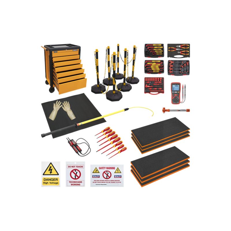 Ampio set di attrezzi indispensabili per i veicoli elettrici /ibridi. Contenuto: APPD7O- Carrello a 7 cassetti con apertura push-to-open, con cassetti a cuscinetti a sfera, ruote Ø125 mm, due ruote piroettanti con bloccaggio e due fisse, pannelli laterali perforati per appendere strumenti e accessori,verniciatura a polvere resistente alla ruggine e ai solventi.Tutti i cassetti sono forniti con rivestimento per cassetti in EVA da 2 mm. Parte superiore e angoli rivestiti in plastica per evitare danni durante gli spostamenti in officina o garage.Piano in plastica dotato di inserto in acciaio inox. Dotato di serrature a cilindro e fornito con due chiavi.Dimensioni complessive (L x P x A): 702 x 477 x 993 mm. SF30OR (x3)- 1200 x 550 x 30mm Easy Peel Shadow Foam Arancione/nero SF50OR (x3)-1200 x 550 x 50mm Easy Peel Shadow Foam Arancione/nero PPHY-Tester ad alta tensione CAT IV 1000V Veicoli ibridi/elettrici Tester di tensione professionale 2 poli CAT IV 1000V per il controllo dell'alta