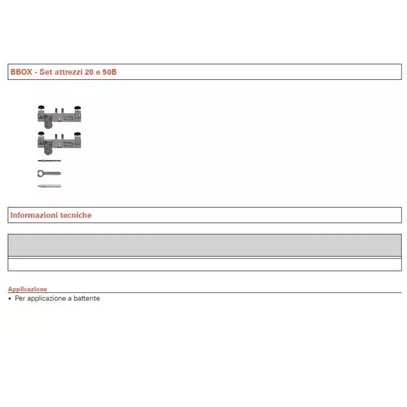 Set in scatola contenente gli attrezzi per il montagggio a battente delle cerniere anuba SFS (20 e 50B) d.14-16 mm. Ogni set comprende 2 dime di foratura, 2 punte, 2 fermapunta, 2 perni di registro e 2 ganci di avvitamento.