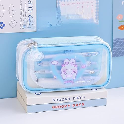 Attria Astuccio trasparente con stampa di coniglio carino con cartone animato Kawaii per tornare a scuola forniture per matite punch roba multifunzionale (blu)