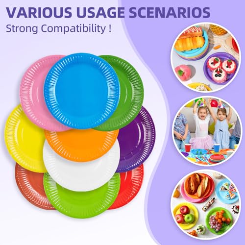 【Quantità e colore sufficienti】La confezione contiene 100 piatti di carta colorati in un totale di 10 colori diversi. Il diametro dei piatti da festa è di 18 centimetri (7 pollici) e possono essere utilizzati per progetti di bricolage o per servire il cibo.