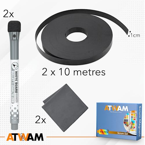 ATWAM - 416 magneti e accessori MEGA Set - Scrum & Kanban - Strisce magnetiche scrivibili - Per lavagne bianche, lavagne magnetiche, pareti magnetiche e frigoriferi