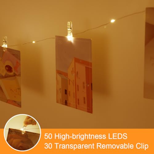 AUAUY Luci Per Foto, 5M 50LED Camera da Letto Per Foto, Catena Luminosa Lucine con 30 Clips, Lucine Led Decorative per Camere, Decorazioni Camera da Letto, Festa, Matrimonio(Batteria Caricata)