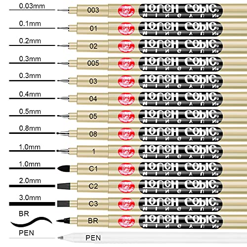 【PENNE FINELINER SET - MULTI-SIZE】 Il nostro set di penne per calligrafia viene fornito con 14 penne per linee artistiche nere con punte di diverse dimensioni, tra cui 1,0 mm (C1), 2,0 mm (C2), 3,0 mm (C3), 0,1 mm (01), 0,2 mm(02), 0.3mm(03), 0.4mm(04), 0.5mm(05), 0.8mm(08), 0.03mm(003), 1.0mm, 0.3mm(005), penna a sfera e pennello( BR), che offre una varietà di dimensioni per soddisfare le tue esigenze e sono ideali per disegnare, prendere appunti, scrivere a mano e fare schizzi.