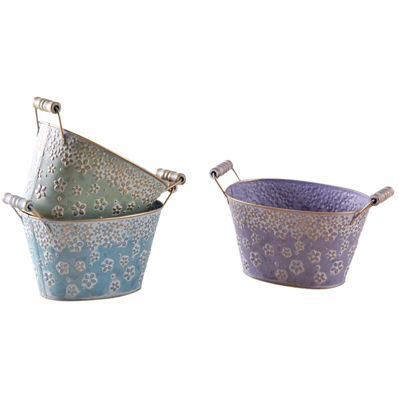 Aspetto Colore Viola Blu Verde Finiture Patina Materiale principale Metallo Materiali secondari Legno (maniglie) Dimensioni Altezza (in cm) 11,00 Altezza con maniglie (in cm) 13,00 Lunghezza (in cm) 18,00 Profondità (in cm) 14,00 Altre caratteristiche Composizione Set di 3 cestini in colori assortiti Peso (in kg) 0,17 Cestino ovale in metallo con motivo floreale 18 cm (Set di 3)