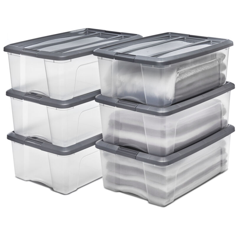 Set mit 6 Aufbewahrungsboxen, 30 l, mit Clips, stapelbar - NTB-30 - L58 x B39,5 x H21 cm, Grau/Transparent - Iris Ohyama