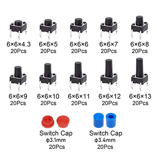 AUKENIEN 12 Valori 240 Pezzi Momentary Switch Micro Interruttore di Pulsante Tattile Kit 6MM x 6MM 4 pin Momentaneo Pulsanti con Push Button cappuccio