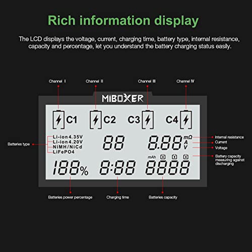 【Display LCD intelligente】 Questo caricabatterie con ampio schermo LCD per visualizzare tutti i parametri della batteria, come tensione, corrente, tempo di ricarica, percentuale della batteria, resistenza interna e capacità della batteria.La retroilluminazione LCD si spegnerà dopo 1 minuto senza alcuna operazione.