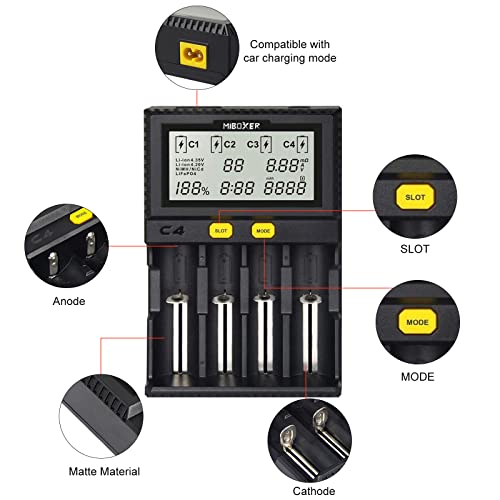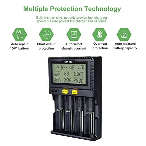 【Facile da usare】 Questo caricabatterie intelligente può caricare 4 batterie ricaricabili contemporaneamente. Corrente di carica fino a 1,5 A/slot, il caricabatterie rileverà automaticamente il tipo di batteria inserita e selezionerà la corrente di carica ottimale, puoi anche scegliere manualmente. Adatto sia per principianti che per utenti professionali.