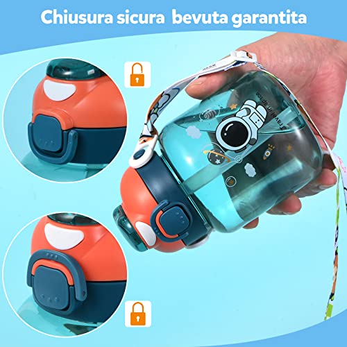 CHIUSURA DI SICUREZZA - Borraccia bambini con cannuccia realizzata con la chiusura di sicurezza impedisce l'apertura accidentalmente della borraccia, evitando eventuali fuoriuscite di liquido mentre la borraccia viene trasportata in borse o zaini, riducendo il rischio di bagnare gli oggetti materiale scolastico, portapranzo bambini scuola, porta merenda scuola. La borraccia trasparente per bambini e ideale come borraccia bambini asilo, boraccia bambino scuola, porta bottiglie acqua plastica.