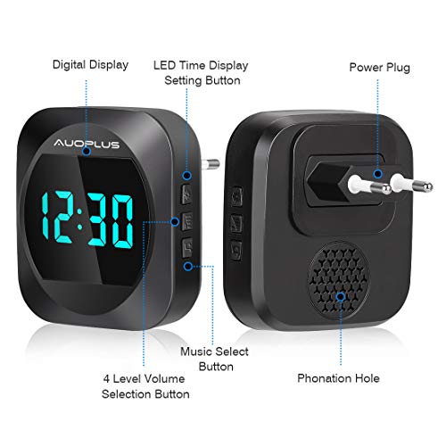 AUOPLUS Tempo Display a LED Campanello Wireless Autoalimentato,Campanello Senza Fili Non Richiede Batteria,Impermeabile IP64,38 Melodie e 3 Livelli di Volume,150M Ambito,1 Trasmettitore e 1 Ricevitore