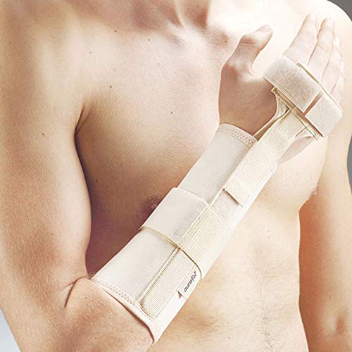 Tutore per epicondilite fabbricato in tessuto di cotone traforato traspirante. La barra in alluminio limita il movimento del polso. Le dita sono mobili dall'articolazione metacarpofalangee in poi.