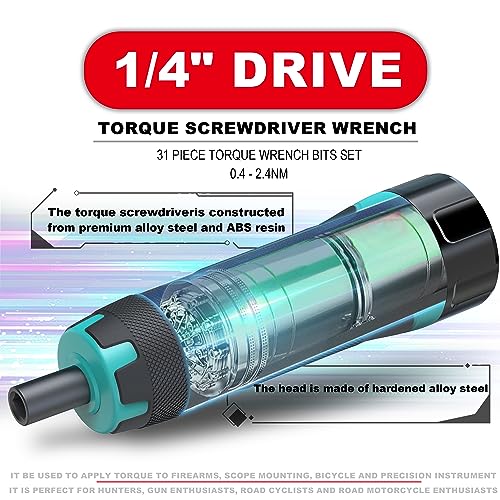 Aurlloct Cacciavite Dinamometrica 1/4" 0.4-2.4 Nm, Chiave Dinamometrica Preimpostato per Bicicletta e Moto, 31 Pezzi Bussoles con Punta Adaptador de Hexagonal de 1/4" a Bussole de 1/4"