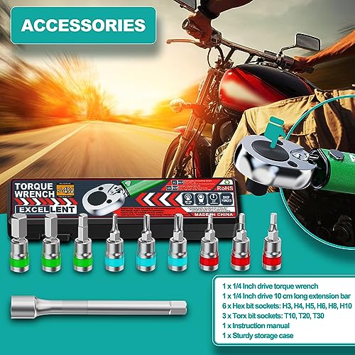 Aurlloct Chiave Dinamometrica 1/4 di pollice, Bicicletta e Moto, Set di Chiavi Dinamometriche 3-33 Nm inclusa Prolunga con 10 cm, inserti per Chiavi a Bussola Esagonali e Torx, 11 pz. Verde