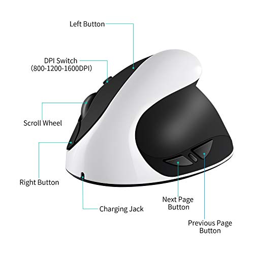AURTEC Mouse Verticale, Mouse Ergonomico Wireless Ricaricabile 2.4G con Ricevitore USB, 6 Pulsanti e 3 DPI Regolabile 800/1200/1600, Bianco