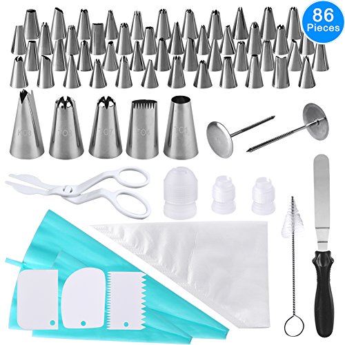 Kit da 86 pezzi: 48 beccucci piccoli in acciaio inox, 5 beccucci grandi per glassa, 2 beccucci piccoli, 1 beccuccio grande, 2 supporti per fiori a chiodo, 1 pinza per sollevare i fiori, 1 spatola ad angolo per glassa (22,9 cm), 3 spatole per torte, 1 scovolino per la pulizia, 2 sac à poche in silicone di diverse dimensioni, 20 sac à poche usa e getta.