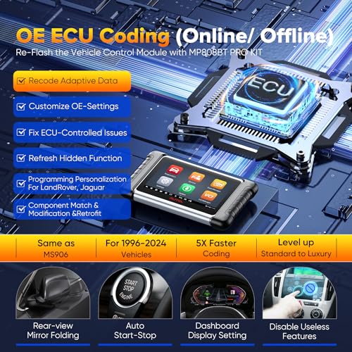 【Codifica ECU Uguale a MS906BT/ MK906 PRO】Autel MP808BT PRO ha ridotto i costi a circa 700 EU-R per ottenere funzioni avanzate di codifica ECU. Autel MP808BT PRO KIT supporta la codifica online ECU per BMW, Porsche, VW, Nissan, Infiniti, Hyundai ecc., la codifica offline per Ford, Mazda, Jaguar, Vauxhall, Opel ecc., Sblocca funzioni nascoste per BMW, VW, Audi, Skoda ecc.: La codifica ECU non è universale, si prega di inviare VIN per controllare.
