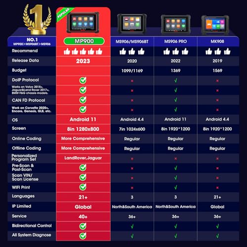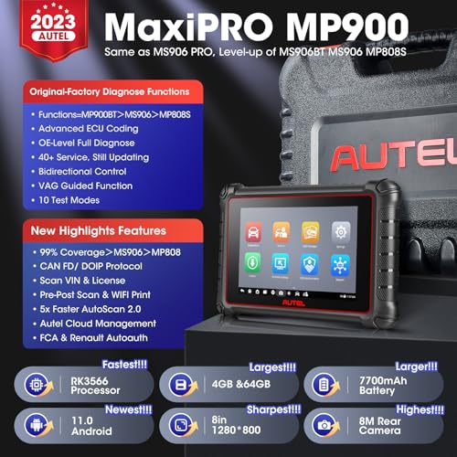 【Autel MP900 Novità 2023】Autel MP900 ha stesse funzioni MS906 PRO metà budget: ✅Programmazione Personalizzazione✅Codifica ECU Avanzata✅40+ Servizi✅Controllo Bidirezionale & 3000+ Test Attivi ✅Diagnostica OEM✅VAG Guidato. Nuove Funzionalità 2023 semplificano cose: Protocollo CAN FD & DOIP Scansione VIN & Licenza Stampa WIFI Scansione Pre & Post Scrivania Remota Autel Cloud Android 11.0, Schermo 8'' 1280*800, Fotocamera 8MP, 4G+64G. Autel MP900: Un gioco che cambia per meccanica.