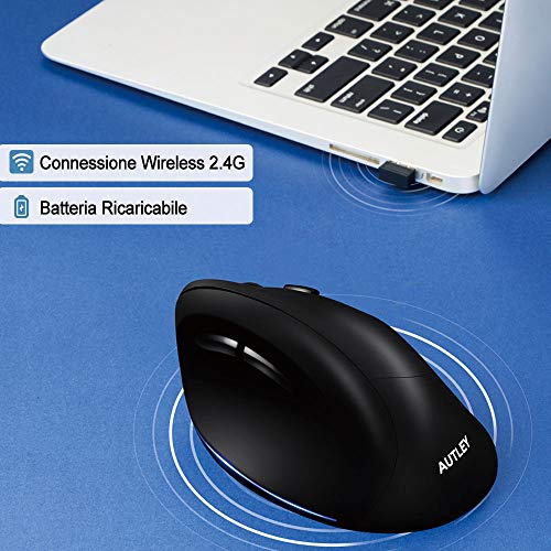 AUTLEY Mouse Verticale, Mouse Ergonomico Wireless Ricaricabile 2.4G con 3 Livelli DPI Regolabili 800/1200/1600 per PC, Desktop, Laptop, Mac - Riduce Il Dolore Mano/Polso (Ottimo per Mani Grandi)