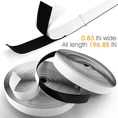 Riceverai gancio 5 m, e nastro del ciclo 5m. Ciascun rotolo di nastro ha una lunghezza totale di 5 metri. La parte posteriore del nastro è autoadesiva.