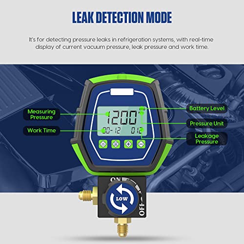 I misuratori HVAC digitali hanno la modalità di misurazione della refrigerazione, la modalità percentuale di vuoto e la modalità di rilevamento delle perdite. Visualizzazione in tempo reale della pressione di vuoto attuale, della percentuale del livello di vuoto, della pressione di fuga e del tipo di refrigerante.