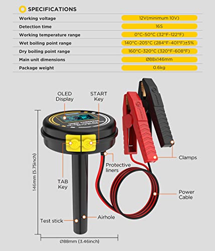 【Funzioni pratiche】 Il liquido dei freni assorbe l'umidità dall'aria e ne abbassa il punto di ebollizione. Il liquido con un punto di ebollizione più basso assorbe il calore più facilmente, bollendo e generando vapore. Il vapore bollente influenzerà la trasmissione del passaggio della pressione del fluido e causerà il guasto del freno. Quindi il rilevamento del punto di ebollizione del liquido dei freni può giudicare la qualità del liquido dei freni.