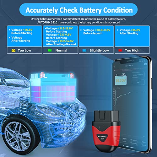 Tester della batteria necessario Hai mai notato molti altri strumenti di scanner senza funzionalità del tester della batteria, che ti costa extra $7,99 USD o più, Tuttavia, AUTOPHIX 3210 può controllare lo stato della batteria e della tensione con un rubinetto sullo schermo del telefono, quindi è in ottime condizioni quando ne hai più bisogno in una giornata invernale gelida senza aprire il cofano.