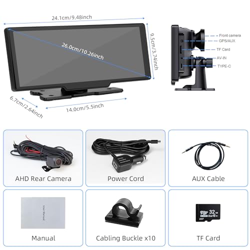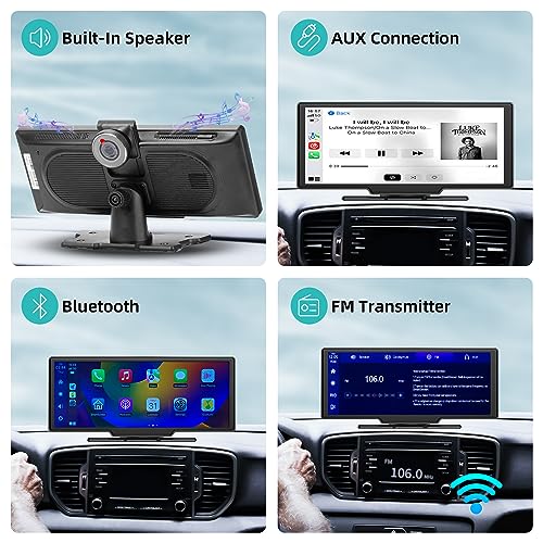 Autoradio Portatile da 10,26 Pollici con Apple CarPlay e Android Auto Senza Fili/Telecamera Anteriore da 2,5K/Telecamera Posteriore/Bluetooth/Mirror Link/FM/AUX/Scheda TF