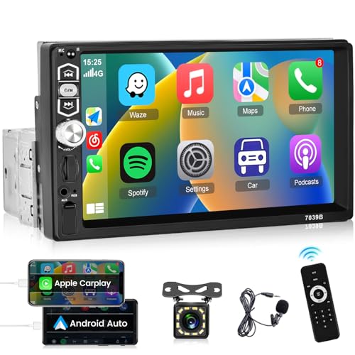 Autoradio 1 Din Con Schermo supporta Apple Carplay e Android Auto, 7 pollici Bluetooth Auto Stereo con FM/EQ/AUX/SWC/Mirror Link+telecamera posteriore e microfono