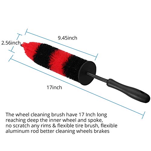 【Spazzola per pneumatici a mano lungo】La spazzola di lunghezza 17 pollici può raggiungere la rota interna e il raggio, senza graffiare i cerchi. Spazzole per pneumatici flessibile, asta di alluminio per una pulizia migliore a freni delle ruote.