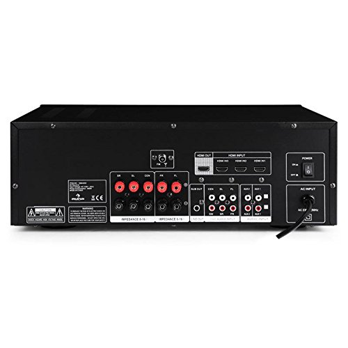 AUNA AV2-H338 - Ricevitore surround, Amplificatore stereo, 1200 W, Ingresso 3 x HDMI, Uscita HDMI 1 x, Ingresso linea 2, Ricevitore radio 40 memorie, Frontale acciaio inox spazzolato, nero