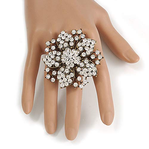 Avalaya Anello grande fiore in cristallo trasparente, colore oro invecchiato, 60 mm D / 7/8 dimensioni regolabile/ispirazione vintage, Oro