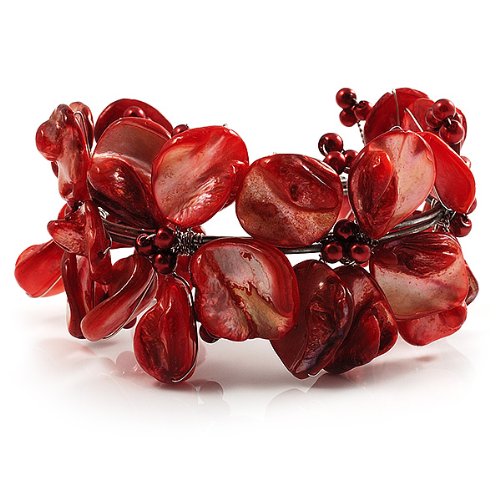 Avalaya - Bracciale a polsino con perle artificiali e corallo rosso (argentato)