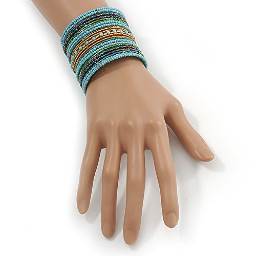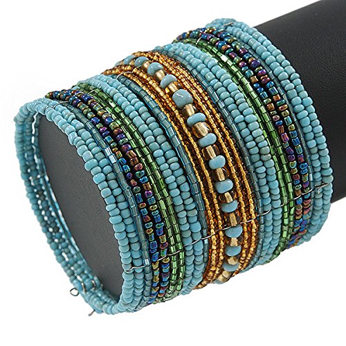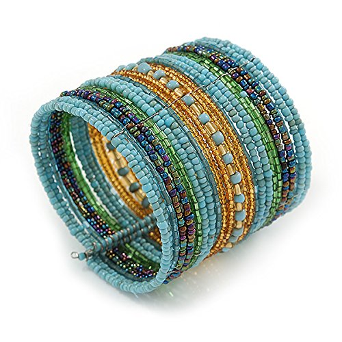 Avalaya - Braccialetto flessibile con perle di vetro blu, oro, pavone/verde mela, regolabile, 60 mm di larghezza