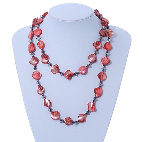 Avalaya - Collana lunga con perle di metallo e conchiglia, colore: Rosso mattone, lunghezza 110 cm