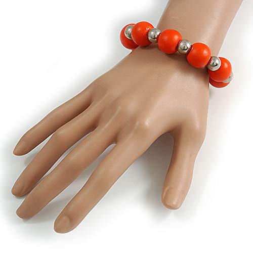Avalaya Set di collana con perline acriliche in legno arancione e argento, orecchini, bracciale lungo 70 cm, Legno Plastica, Perline acriliche.
