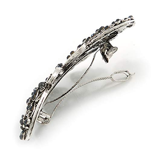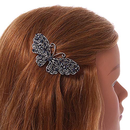 Avalaya - Fermaglio per capelli con farfalla in cristallo blu notte, con finitura argento invecchiato, 70 mm di diametro