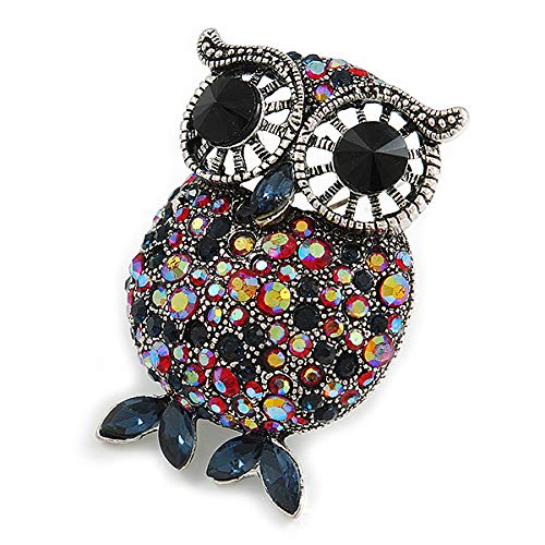 Avalaya - Spilla a forma di gufo in stile vintage, con cristalli rossi e blu, 50 mm di altezza
