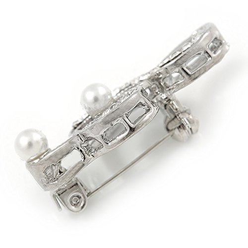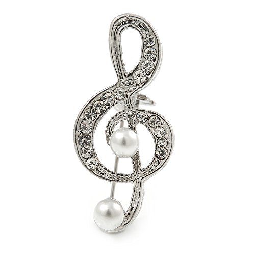Avalaya - Spilla Musicale a Forma di Chiave di Violino, con Cristalli e Perle Sintetiche, tonalità Argento, 35 mm di Lunghezza