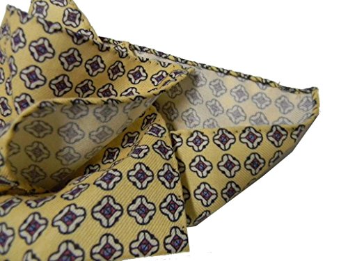 Avantgarde Cravatta lana uomo gialla con disegni beige azzurri e fazzoletto colore giallino abbinato, completa a pochette