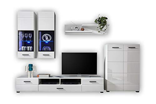 Dettagli prodotto: Parete da soggiorno in truciolato, colore bianco opaco e bianco lucido. Illuminazione LED compresa, non disponibile in altre colorazioni.