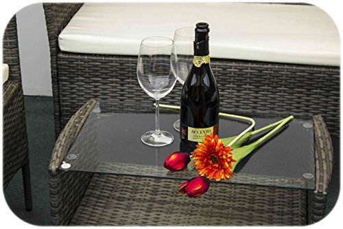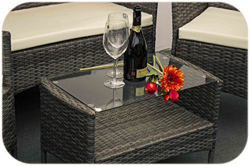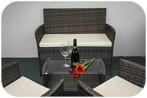 Materiale: Rattan sintetico, Colore: grigio. Materiale stabile e resistente alle intemperie. Sia il divanetto che le due poltroncine vengono fornite di un cuscino spesso e modbido con fodera sfoderabile che ne facialitá di lavaggio.