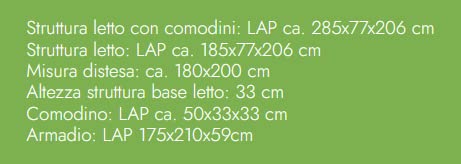 Misure struttura letto con comodini: LAP ca. 285x77x206 cm, Struttura letto: LAP ca. 185x77x206 cm, Misura distesa: ca. 180x200 cm, Altezza struttura base letto: 33 cm, Comodino: LAP ca. 50x33x33 cm, Armadio: LAP 175x210x59 cm